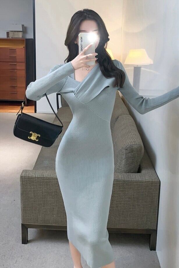 胸元がアシンメトリーのデザインで、女性らしいシルエットを表現したおしゃれなニットワンピースです。